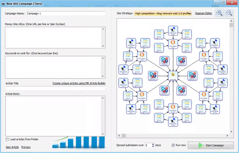 The tool also writes articles for you or spins existing ones, so your campaigns look natural.